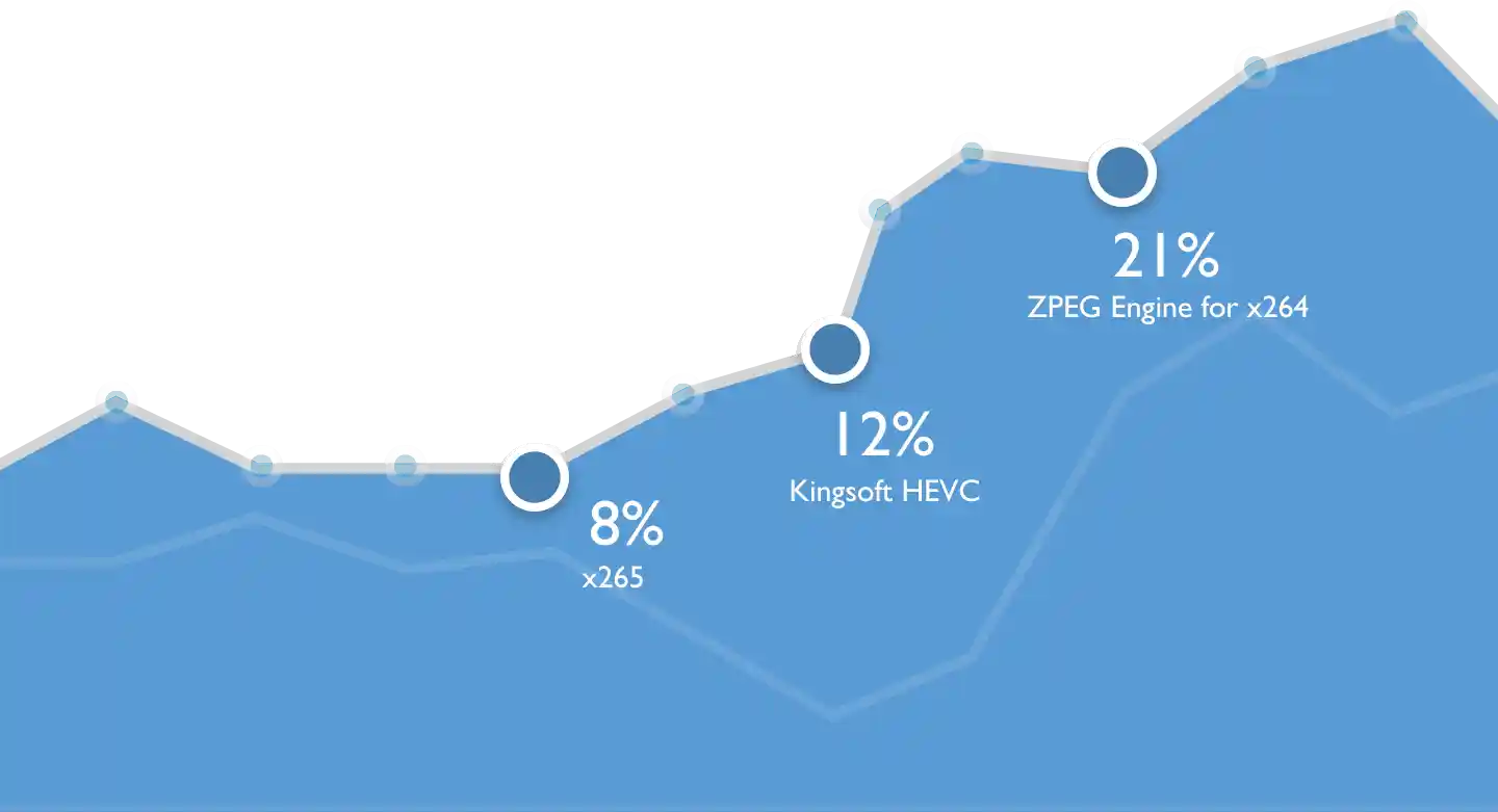 The ZPEG Engine integrates into your existing compressor, be it x264, x265, AV1 – or FFmpeg! Use of the ZPEG Engine reduces your file sizes and streaming costs by an average of 21% (HD), and UHD(4K) by 30%, all without without changing the visual experience.